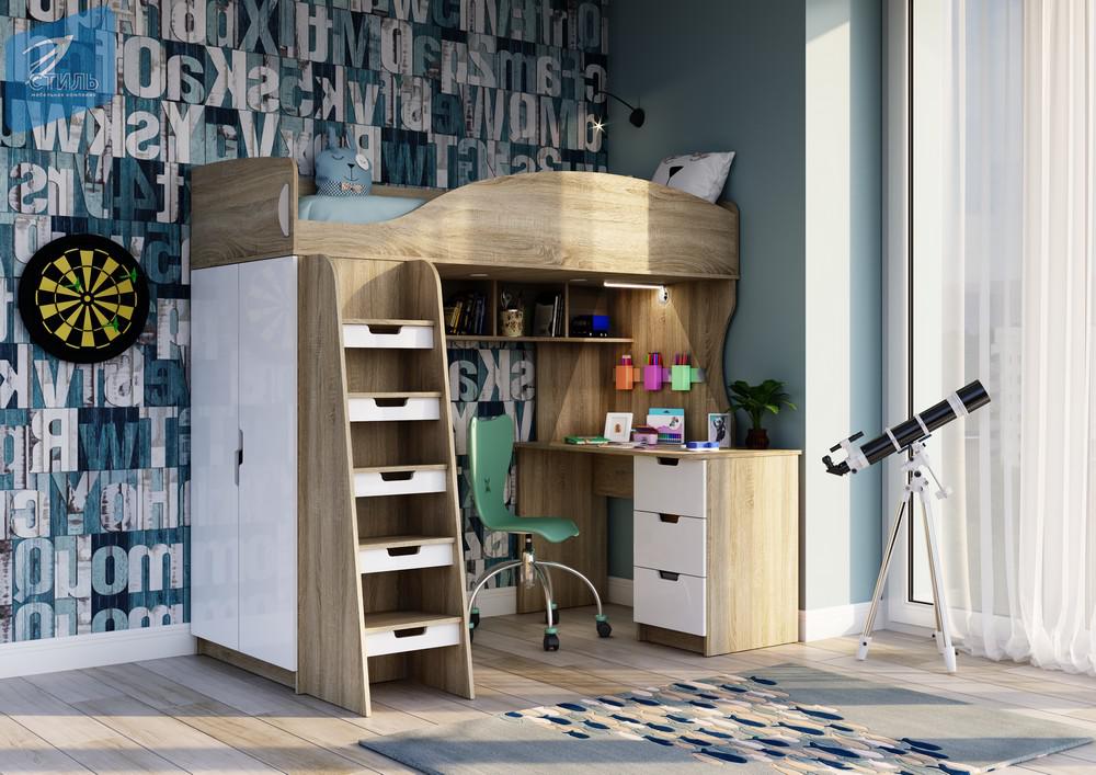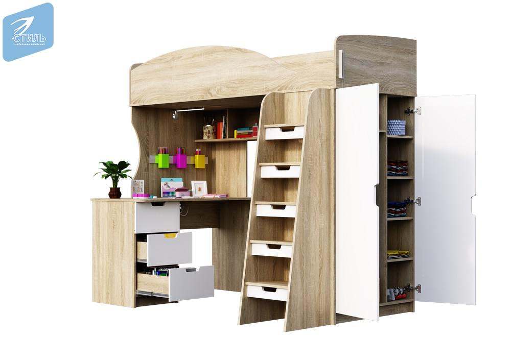 Детская кровать-чердак КР-111 «Сэнди» Дуб сонома светлый/МДФ Белый глянец