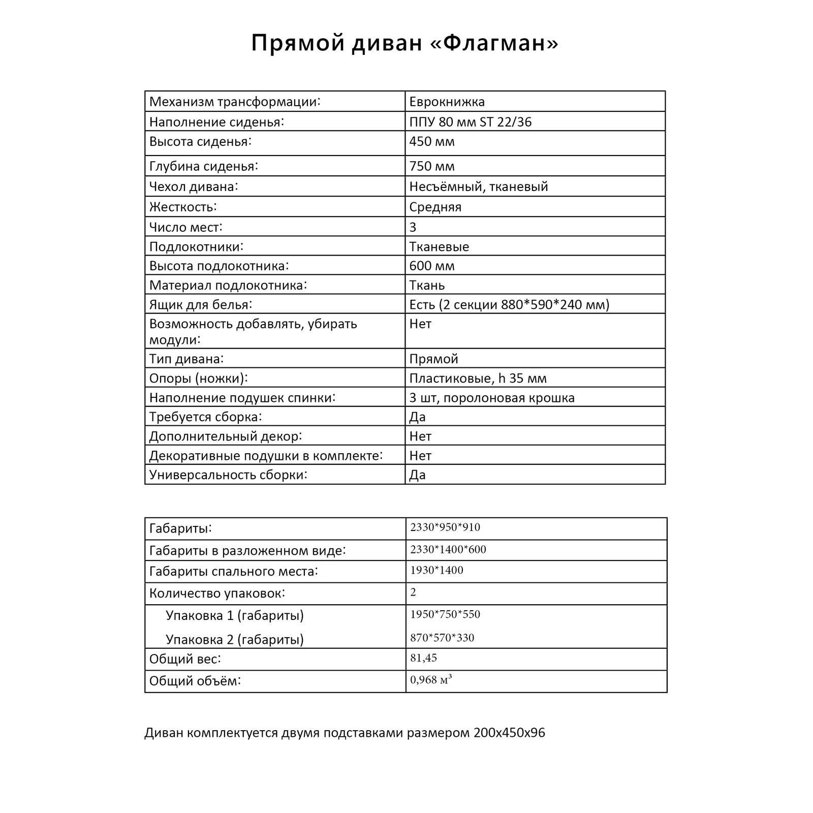 | Тип дивана: | Прямой |