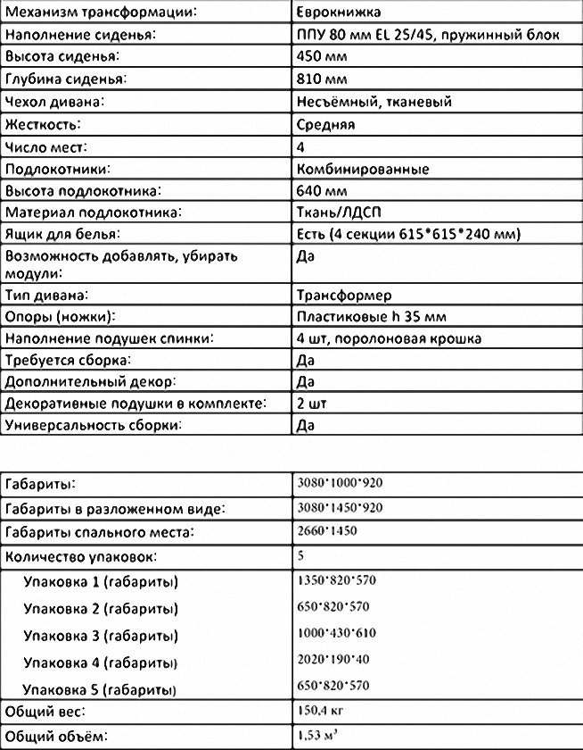 | Тип дивана | П-образный, Трансформер, Диван-трансформер, Еврокнижка-трансформер |