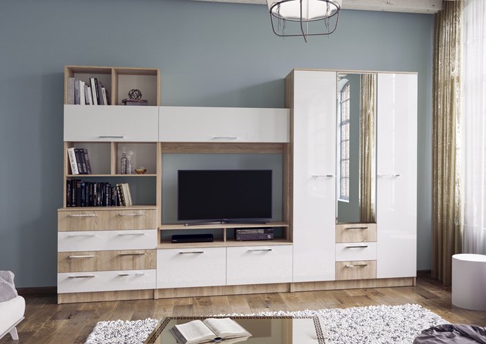Модульная гостиная «11» Дуб Сонома светлый/МДФ Белый глянец