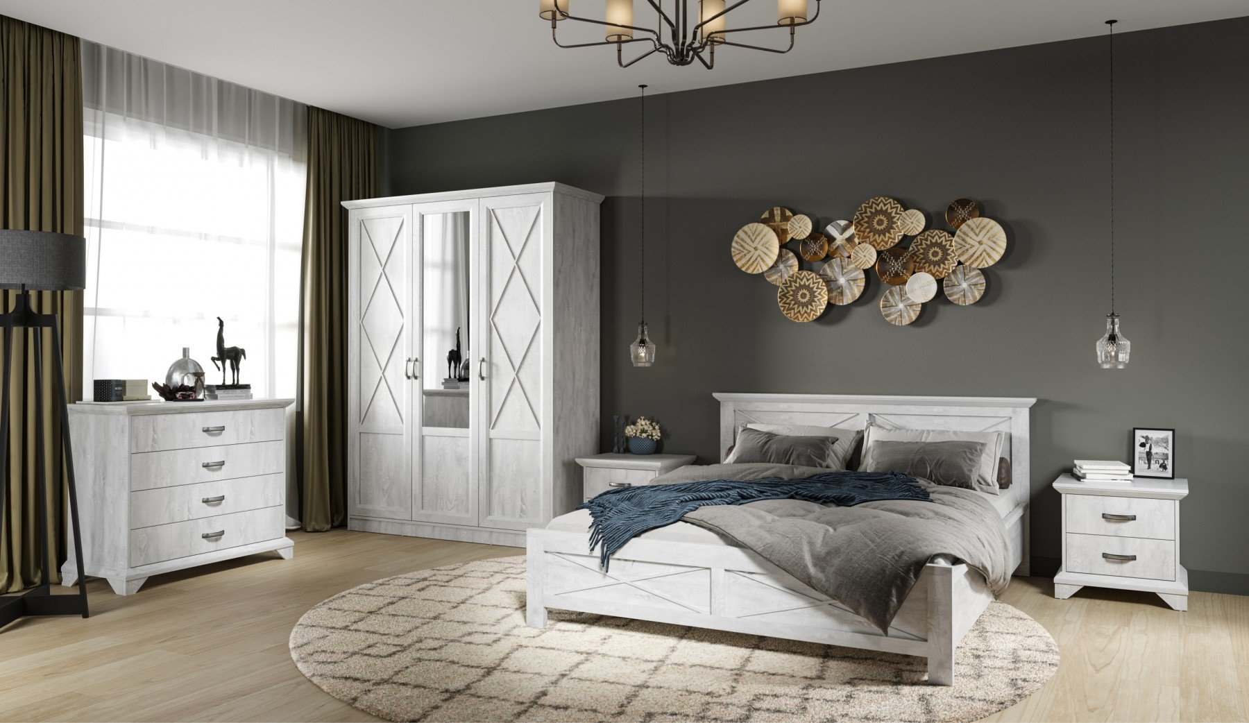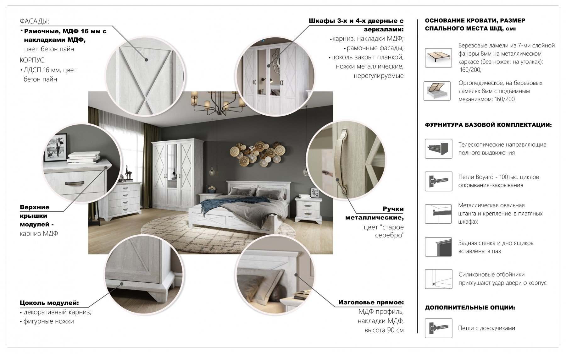 | Комплектация | С комодом, Со шкафом, С прикроватными тумбочками |