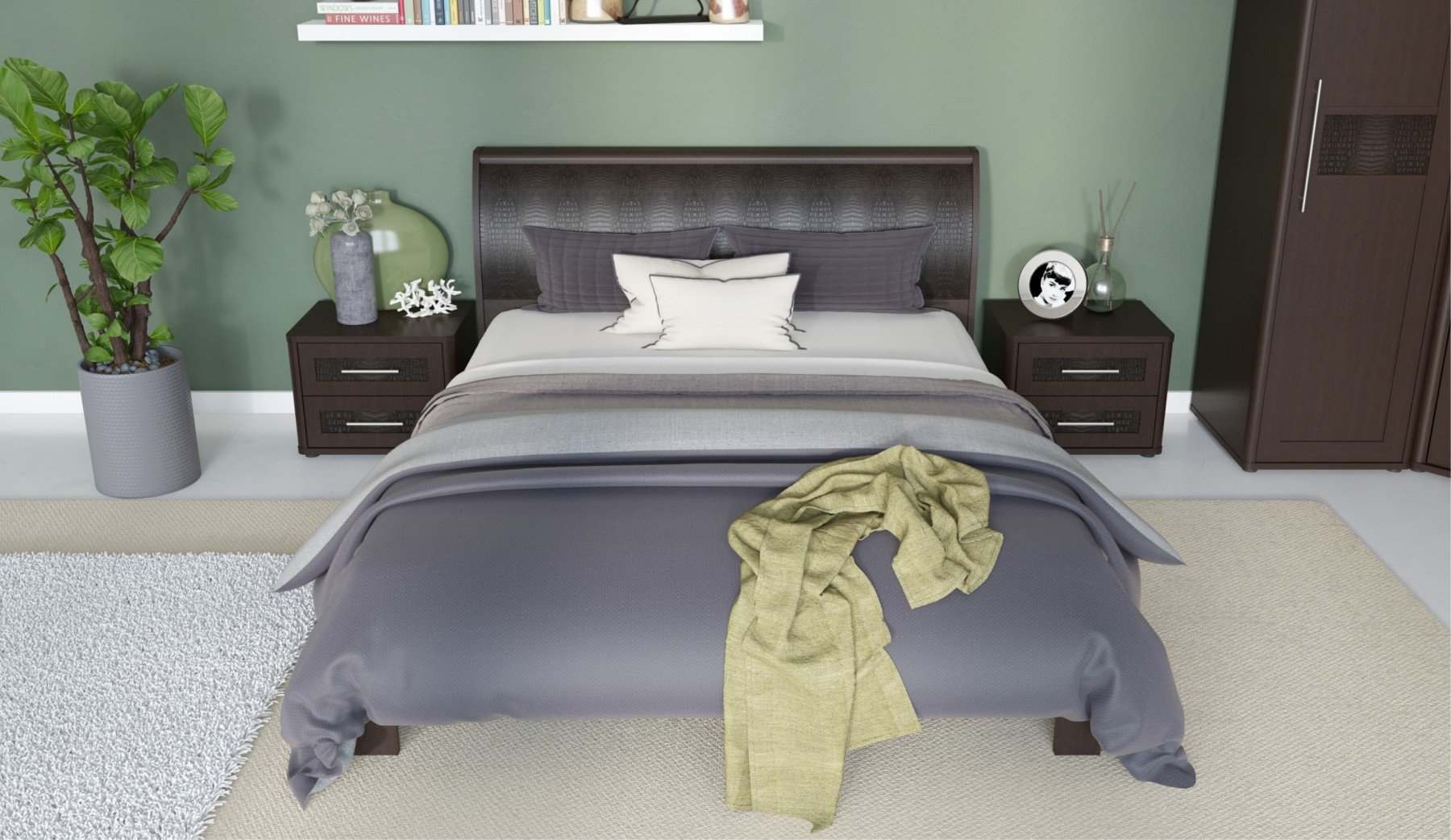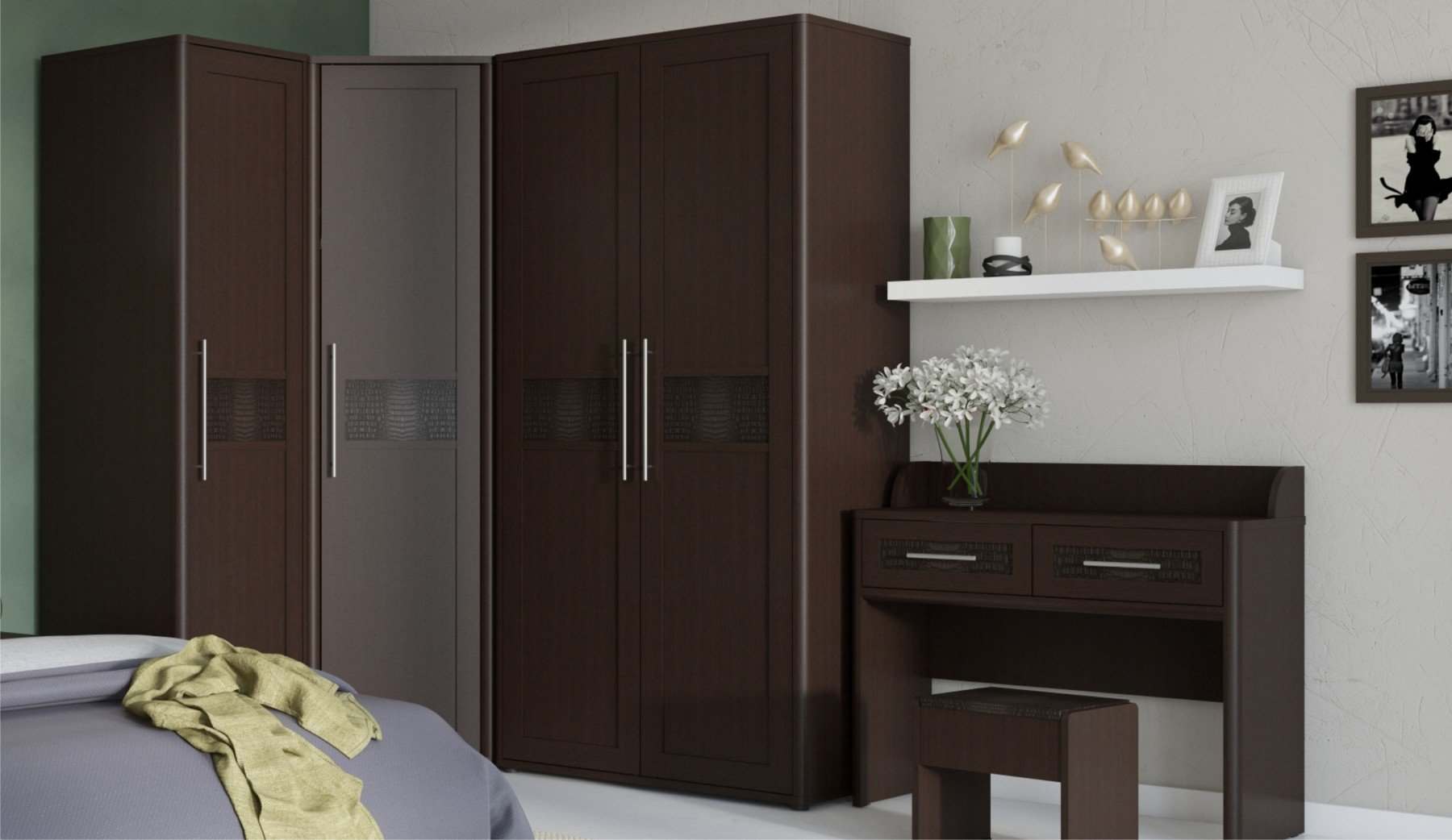 | Комплектация | С угловым шкафом, С туалетным столиком, С прикроватными тумбочками |