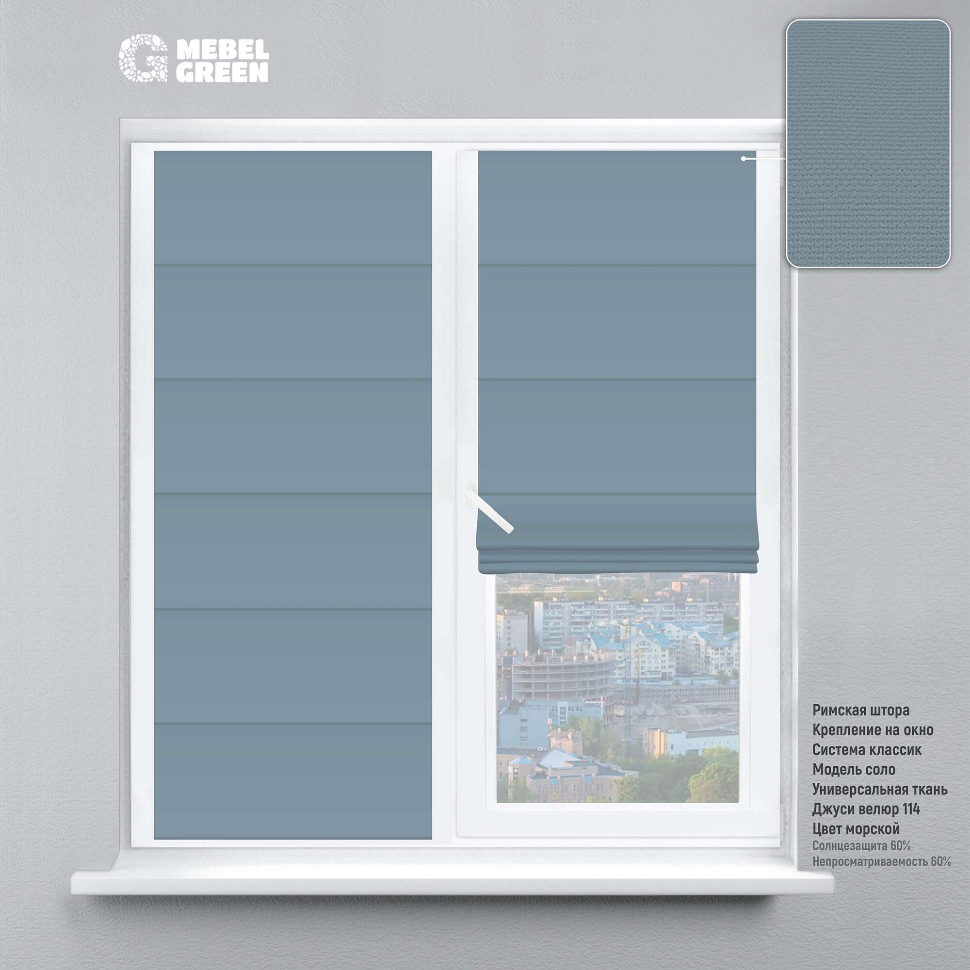 Римская штора на окно «Джуси велюр» морской