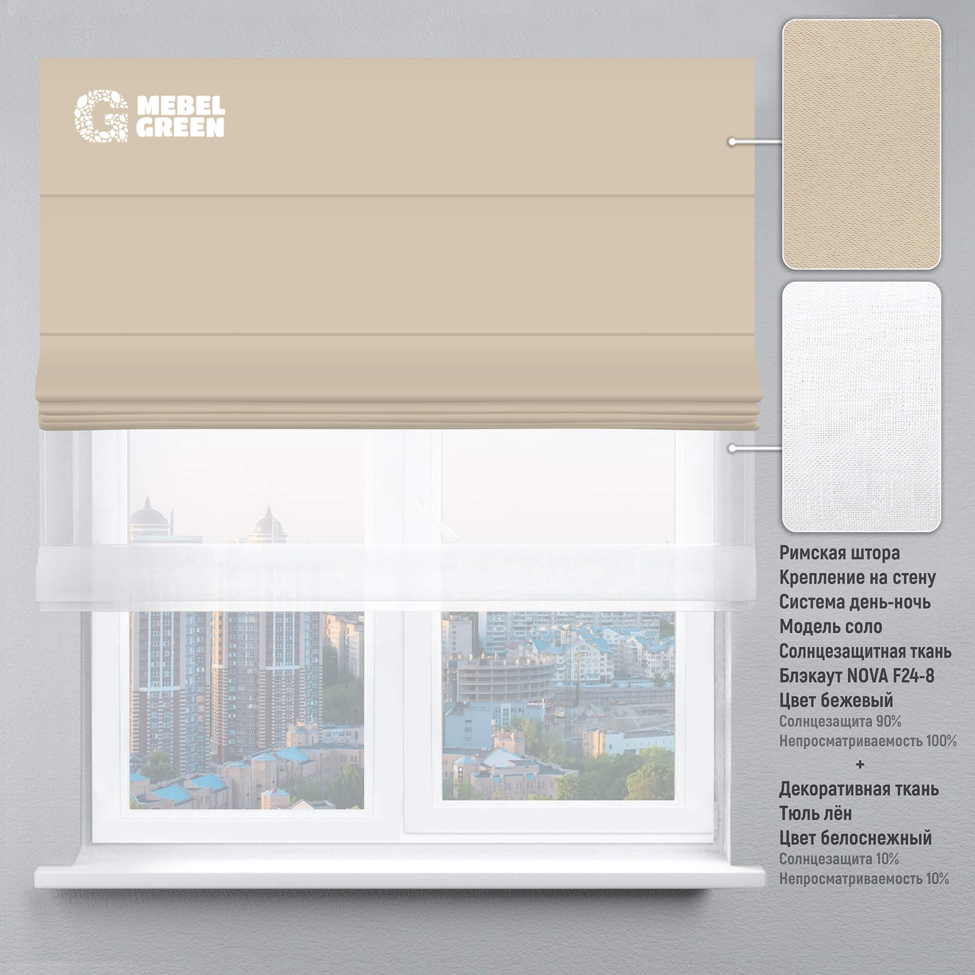 Римская штора система день-ночь для проёма «Блэкаут Nova» бежевый и тюль лён белоснежный