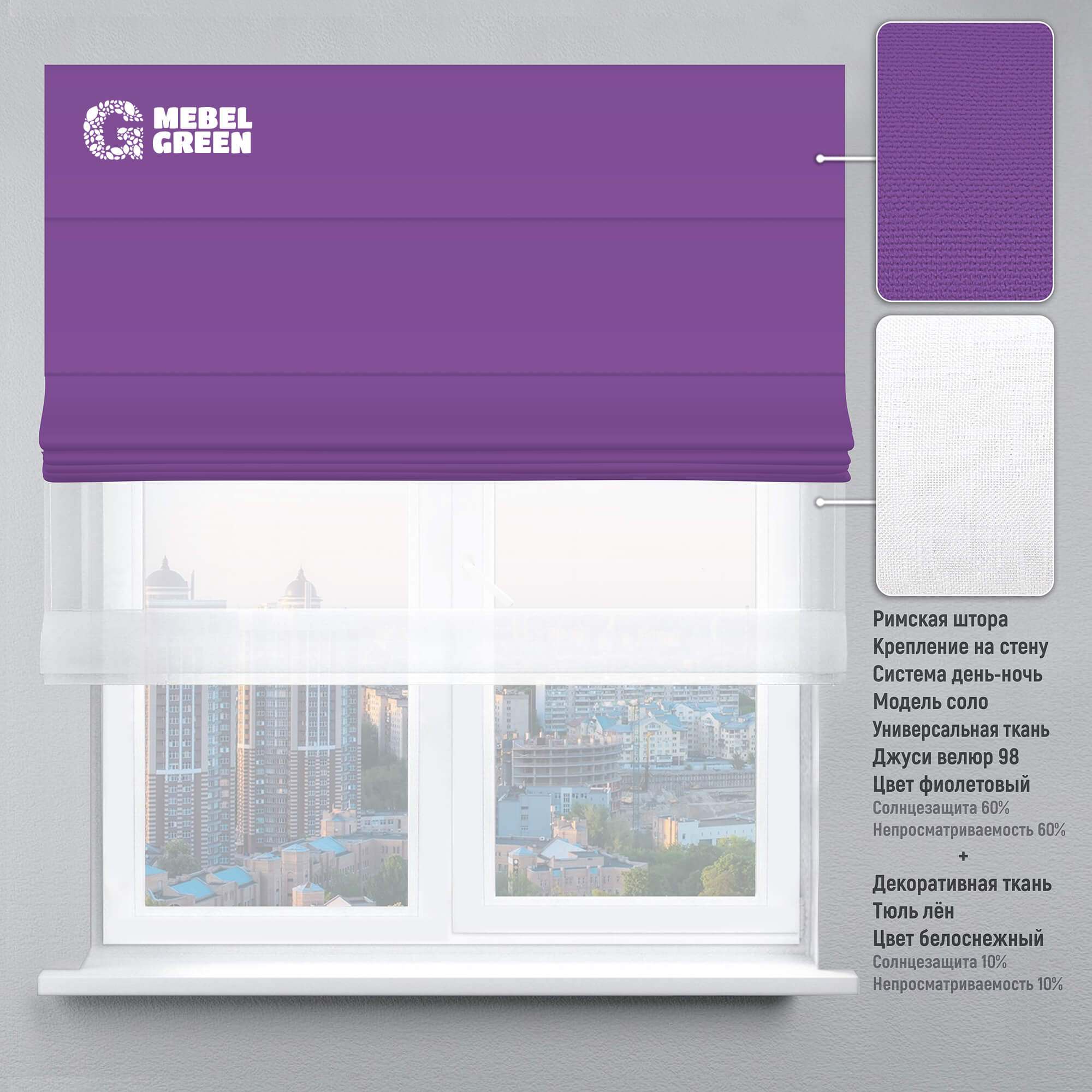 Мы доставим римская штора система день-ночь для проёма «джуси велюр» фиолетовый и тюль лён белоснежный по Симферополю. Доставка до склада + доставка по городу от 0 до 1000₽, в зависимости от объема, количества и веса Вашего заказа. Подробности уточните у менеджеров.