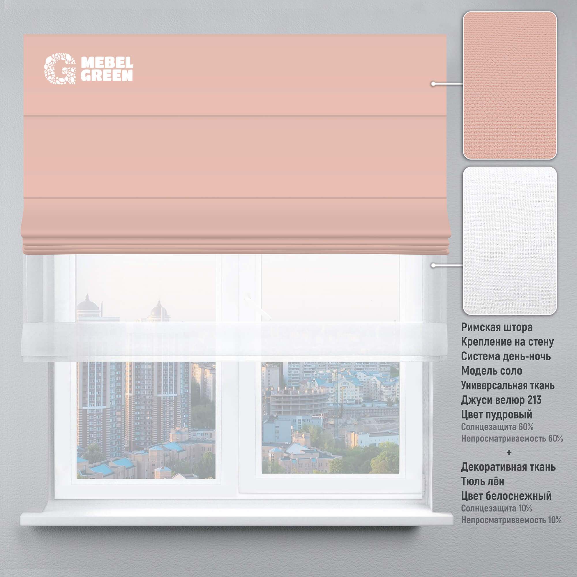 Римская штора система день-ночь для проёма «Джуси велюр» пудровый и тюль лён белоснежный