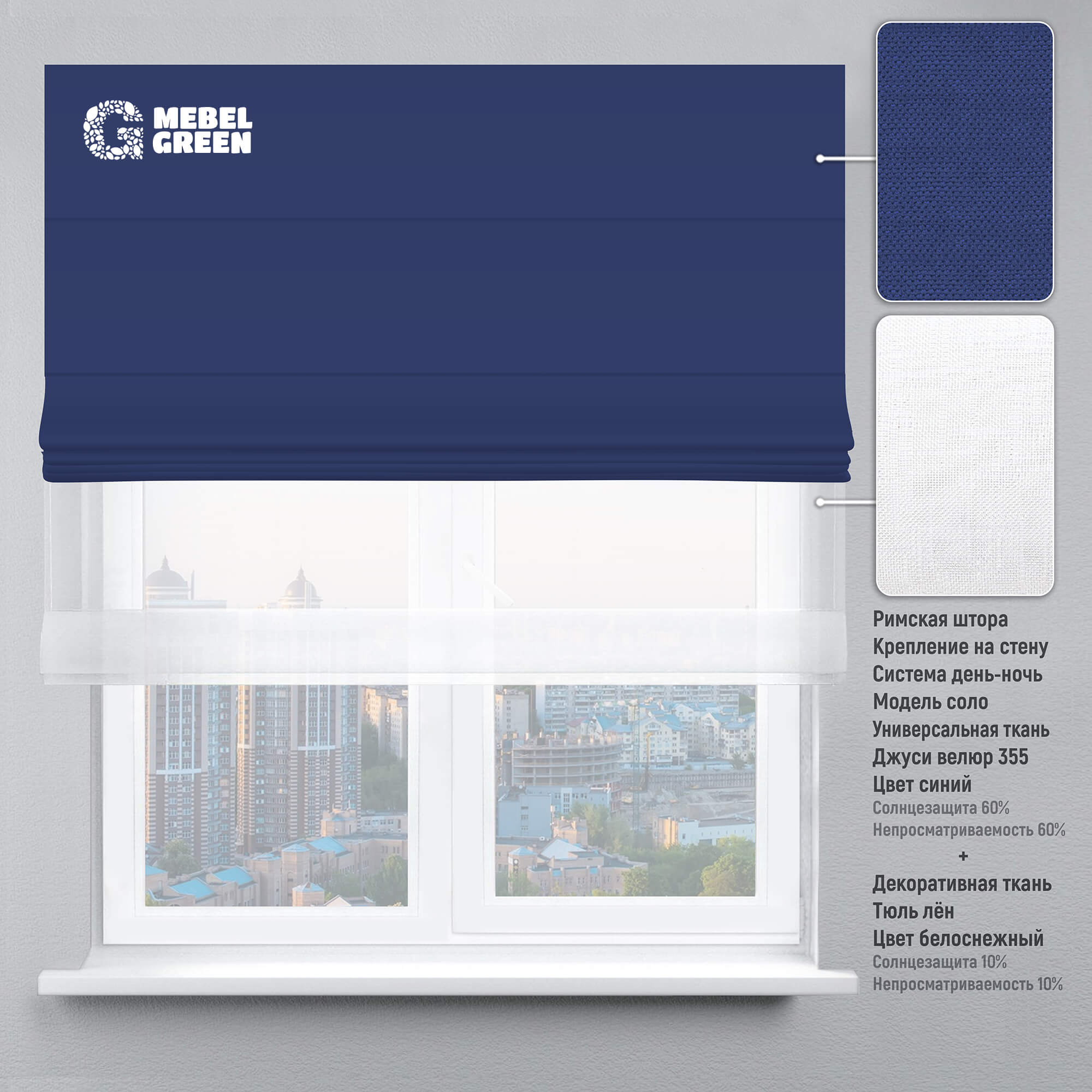 Мы доставим римская штора система день-ночь для проёма «джуси велюр» синий и тюль лён белоснежный по Симферополю. Доставка до склада + доставка по городу от 0 до 1000₽, в зависимости от объема, количества и веса Вашего заказа. Подробности уточните у менеджеров.