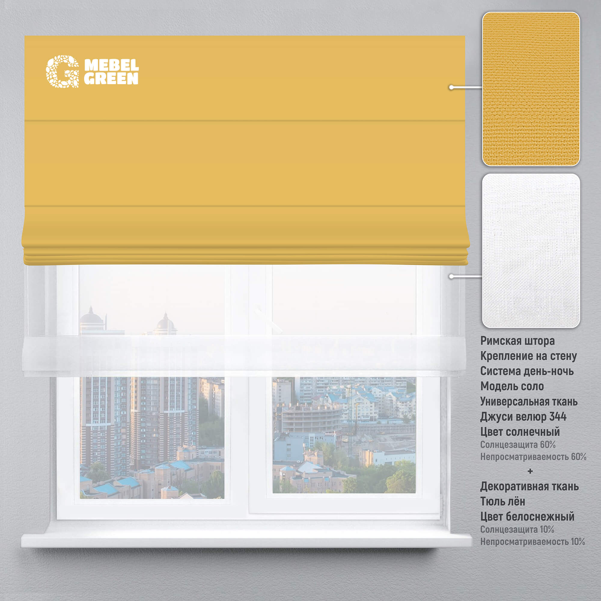 Римская штора система день-ночь для проёма «Джуси велюр» солнечный и тюль лён белоснежный