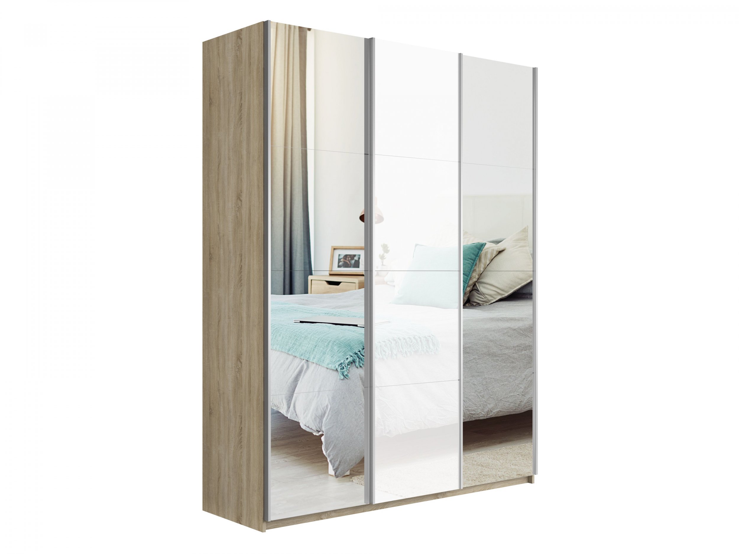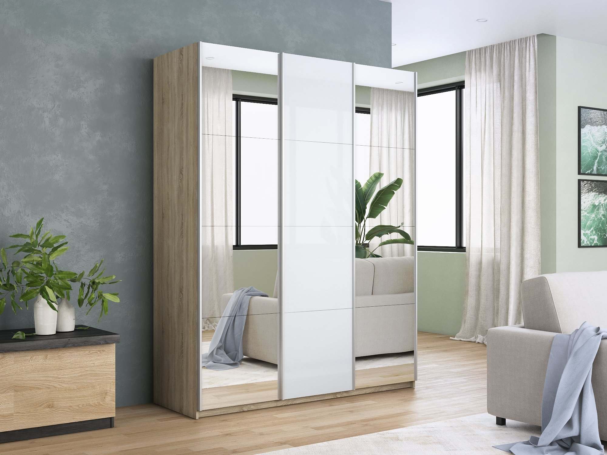 Шкаф-купе 3-х дверный «Прайм» Зеркало/Белое стекло/Зеркало Сонома