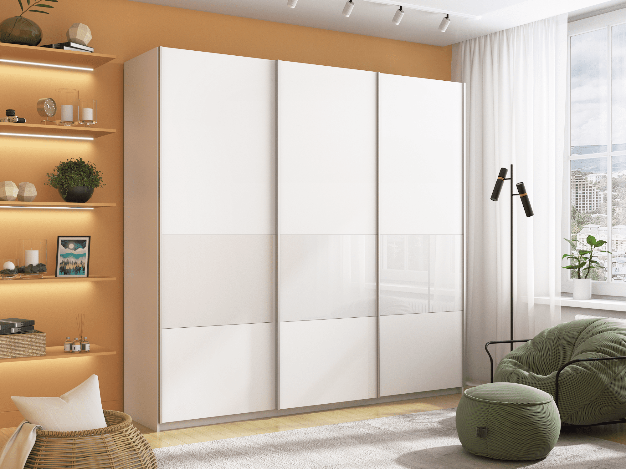 Шкаф-купе 3-х дверный широкий «Прайм» Белый снег/Белое стекло