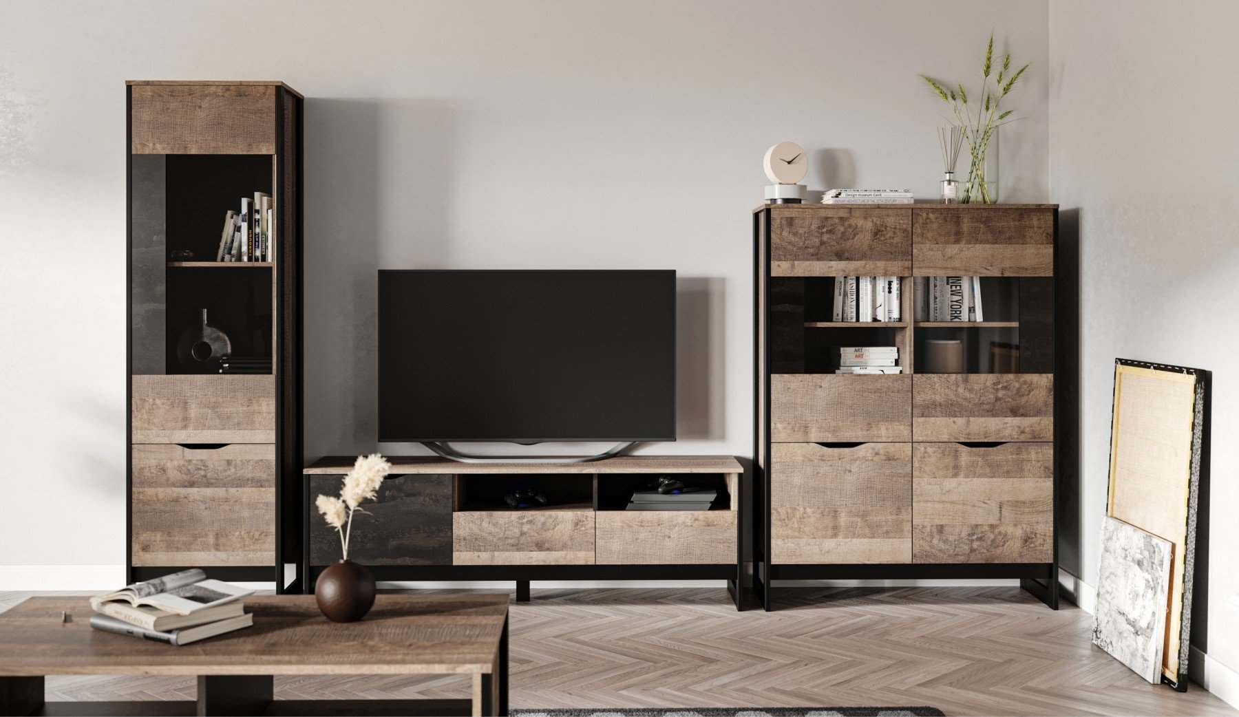 Витрина низкая «Стокгольм» Дуб гранж песочный/Железный камень